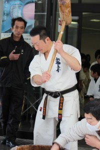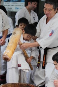 師範の力強い餅つき。
